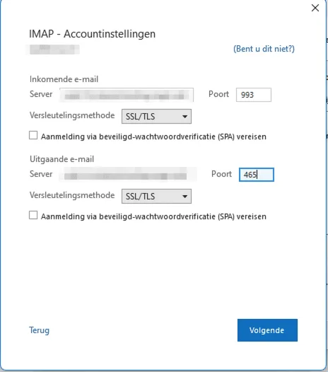 - Vul de ‘Inkomende & uitgaande mailserver’ in en klik op ‘Volgende’. (De mailservers kun je vinden in Mijn Eerlijk Design onder ‘E-mails’ -> Selecteer het juiste e-mail adres -> ‘Instellingen van de e-mailclient’